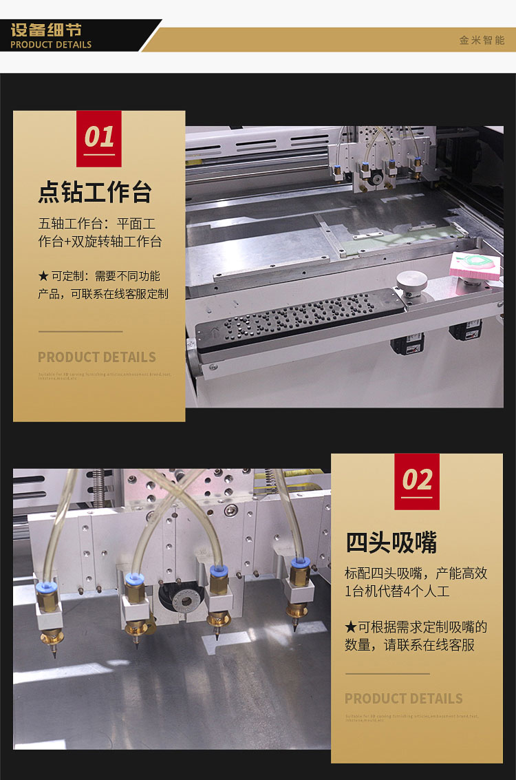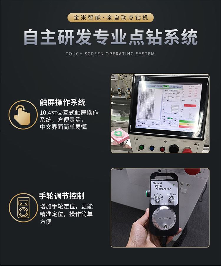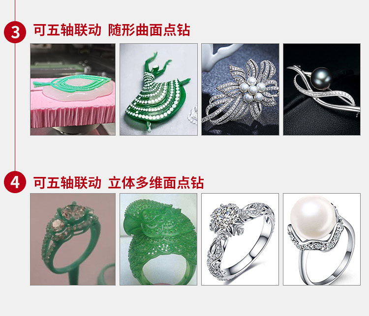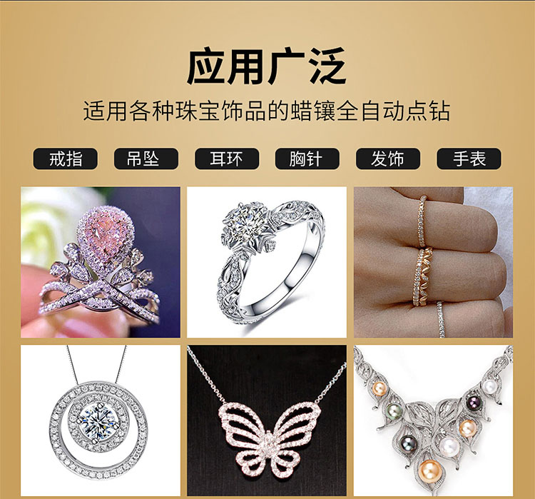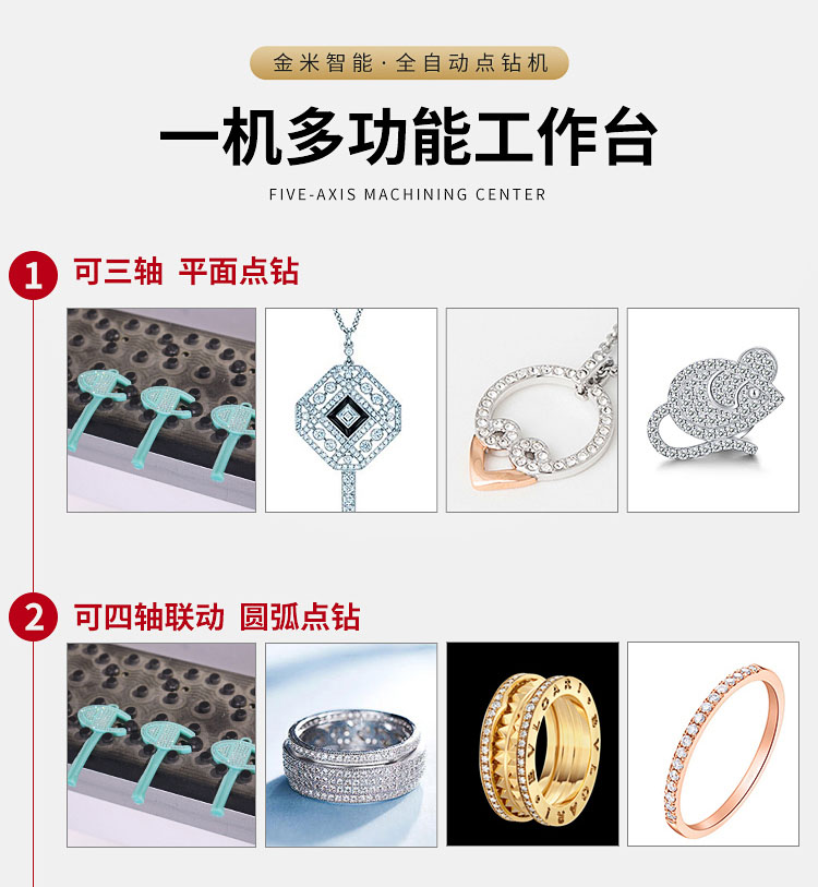 金米智能-珠寶首飾自動點鉆機,是一款用于解決珠寶首飾蠟模鑲鉆效率低而研發的五軸聯動自動點鉆機。效率高,一臺 機器可預借4-8個人工,一小時可鑲9000顆鉆,使生產效率提升數倍并大大縮減人工成本。一機多功能:平面、圓弧、立 體多維面自動點鉆。操作簡單:10.4寸中文觸屏操作系統,傻瓜式操作,簡單易學。適用廣泛:戒指、吊墜、耳飾、胸 針、等各種帶鉆的珠寶飾品自動蠟鑲鉆。