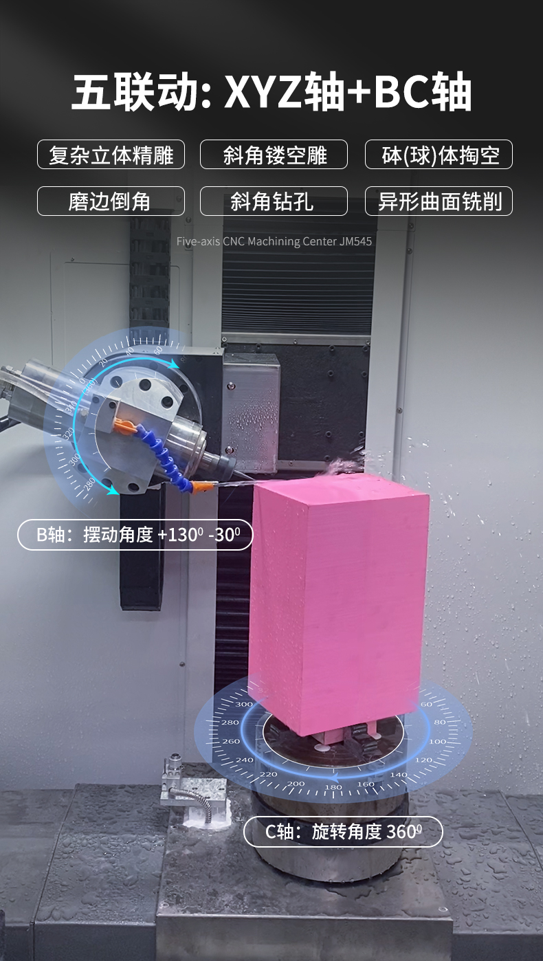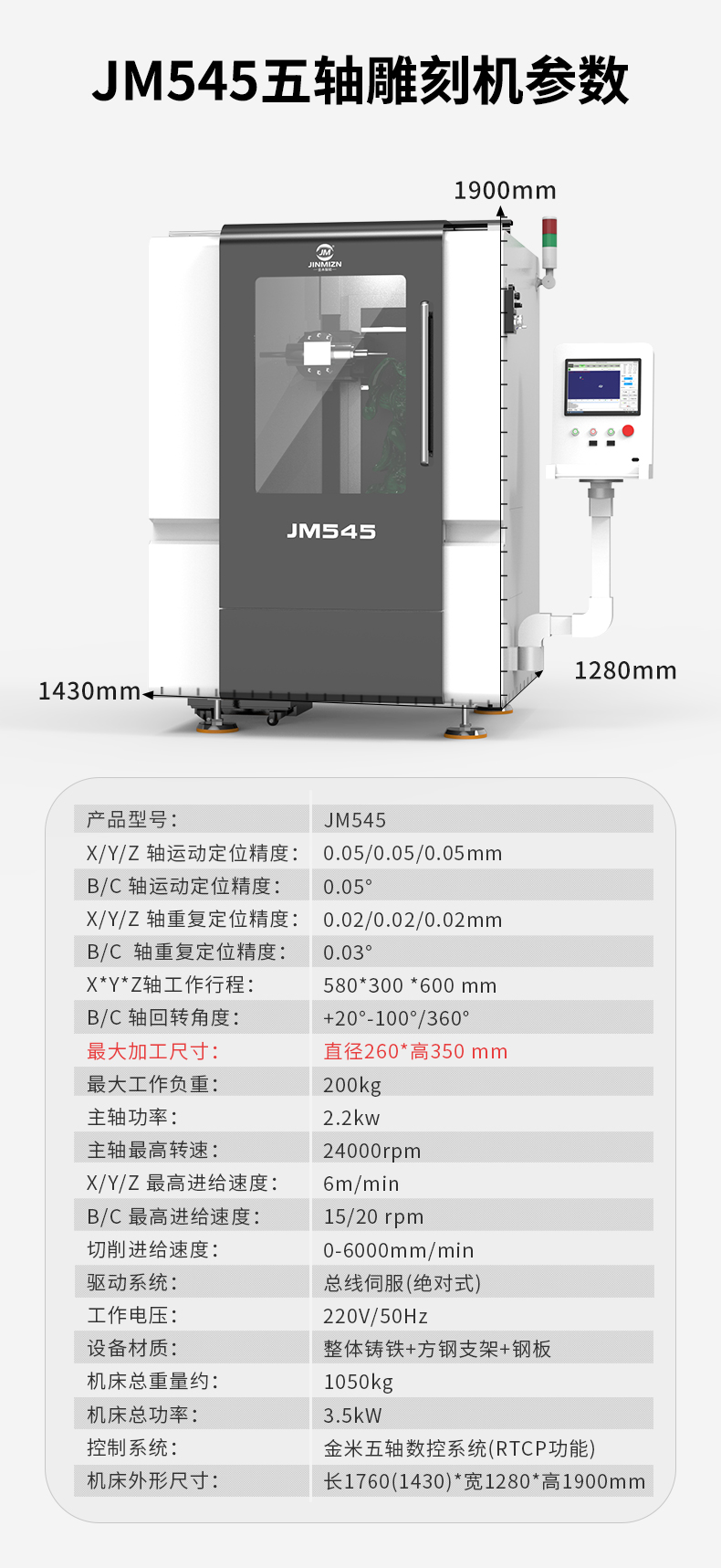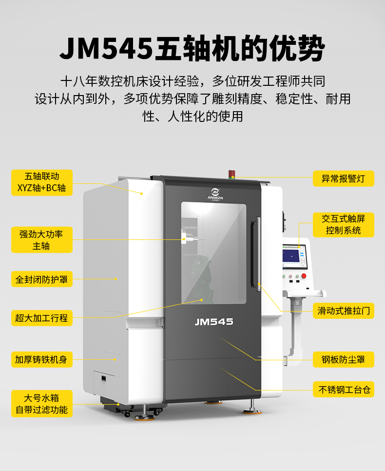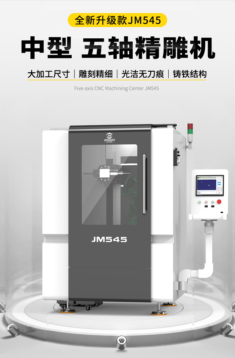 JM5035是一款全封閉式設計的中型五軸聯動雕刻機采用先進的擺頭式+轉臺式(B軸+C軸)設計結構,主軸靈活擺動善于一次性將復雜的立體曲面雕刻、斜角鏤空雕刻、砵體掏空、不規則體雕刻等。 RTCP刀尖跟隨功能:專業五軸觸屏數控操作系統帶RTCP刀尖跟隨功能操作簡單易學。 XYZ三軸均采用高精密直線導軌導向驅動部分采用伺服電機帶動高精度滾珠研磨絲桿。五軸部分采用高精密諧波減速機實現高精度角度定位和傳遞扭矩。 主結構采用整體鑄鐵結構,保障機床長期不變形,加工時保證機床的高剛性、高抗振性能和高精度的平穩運行。