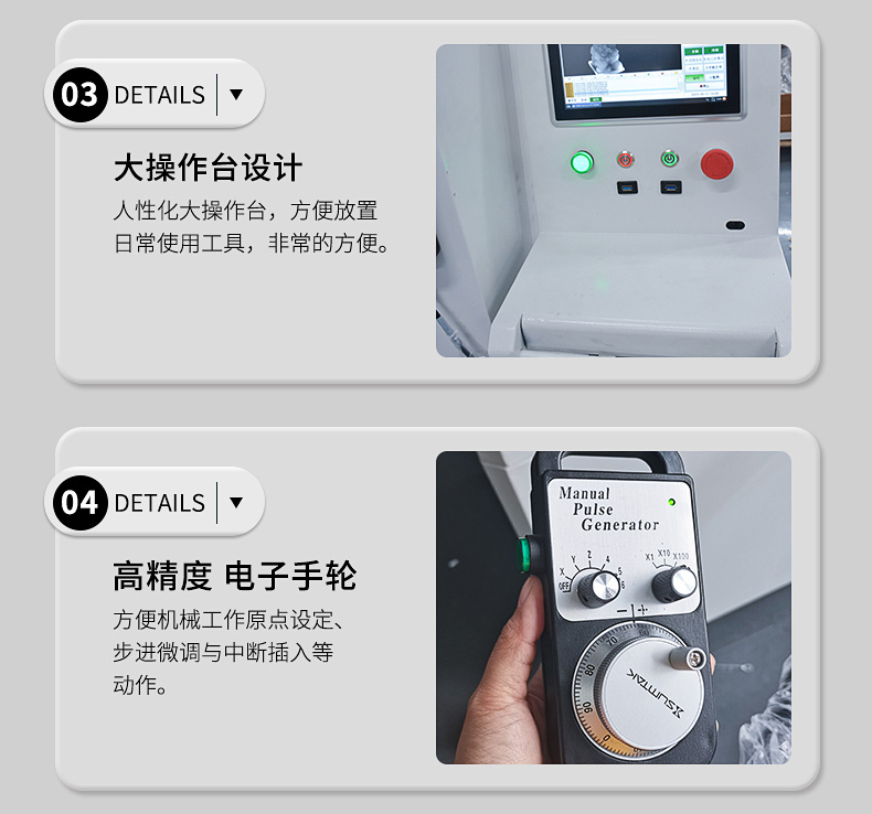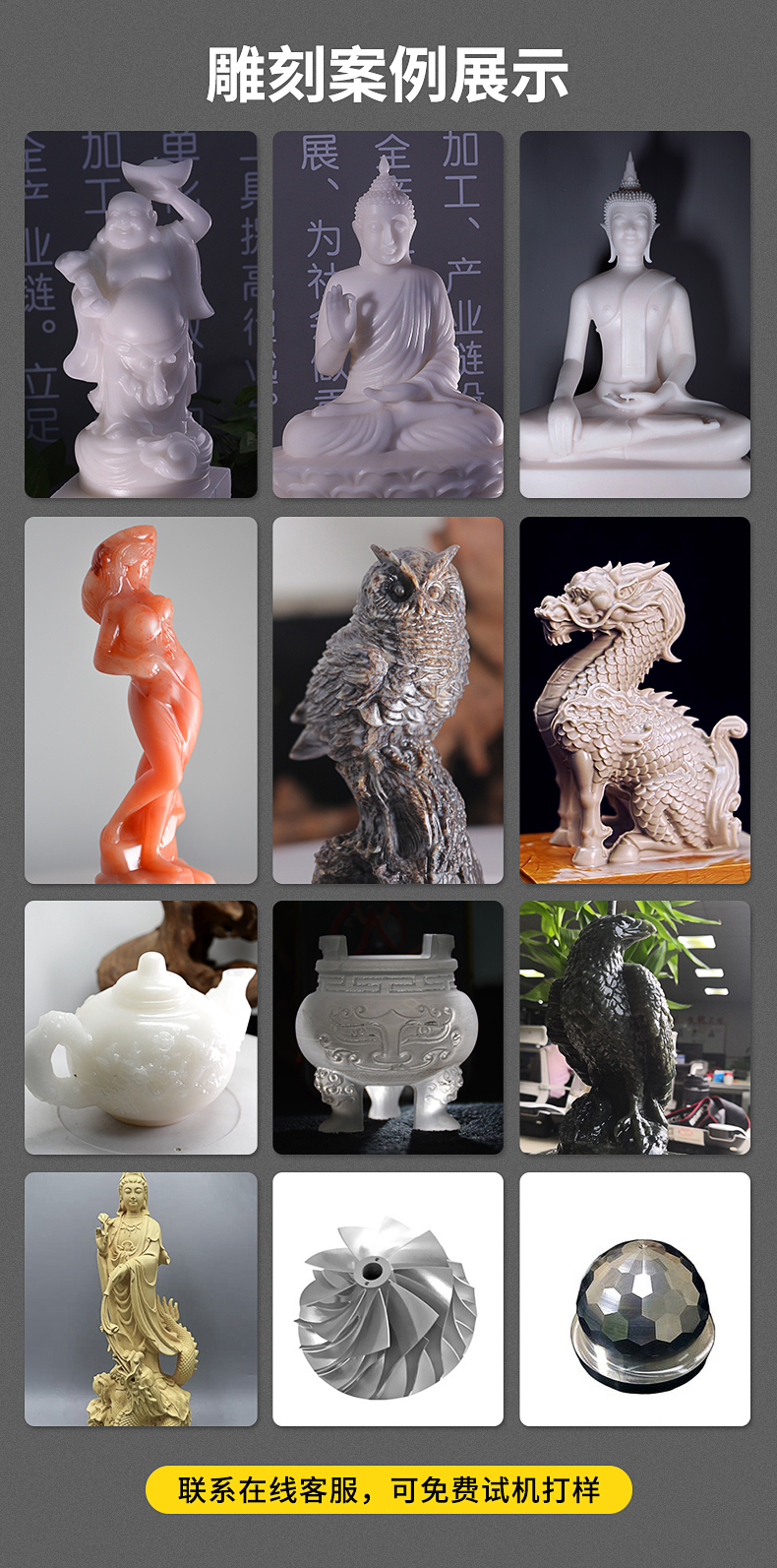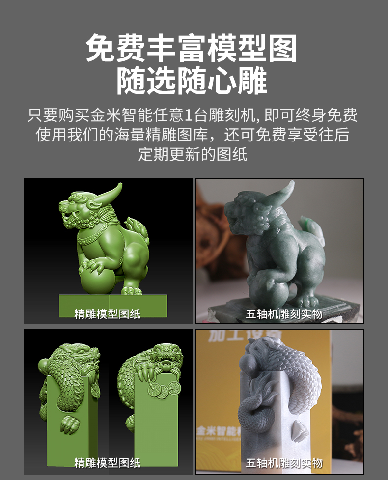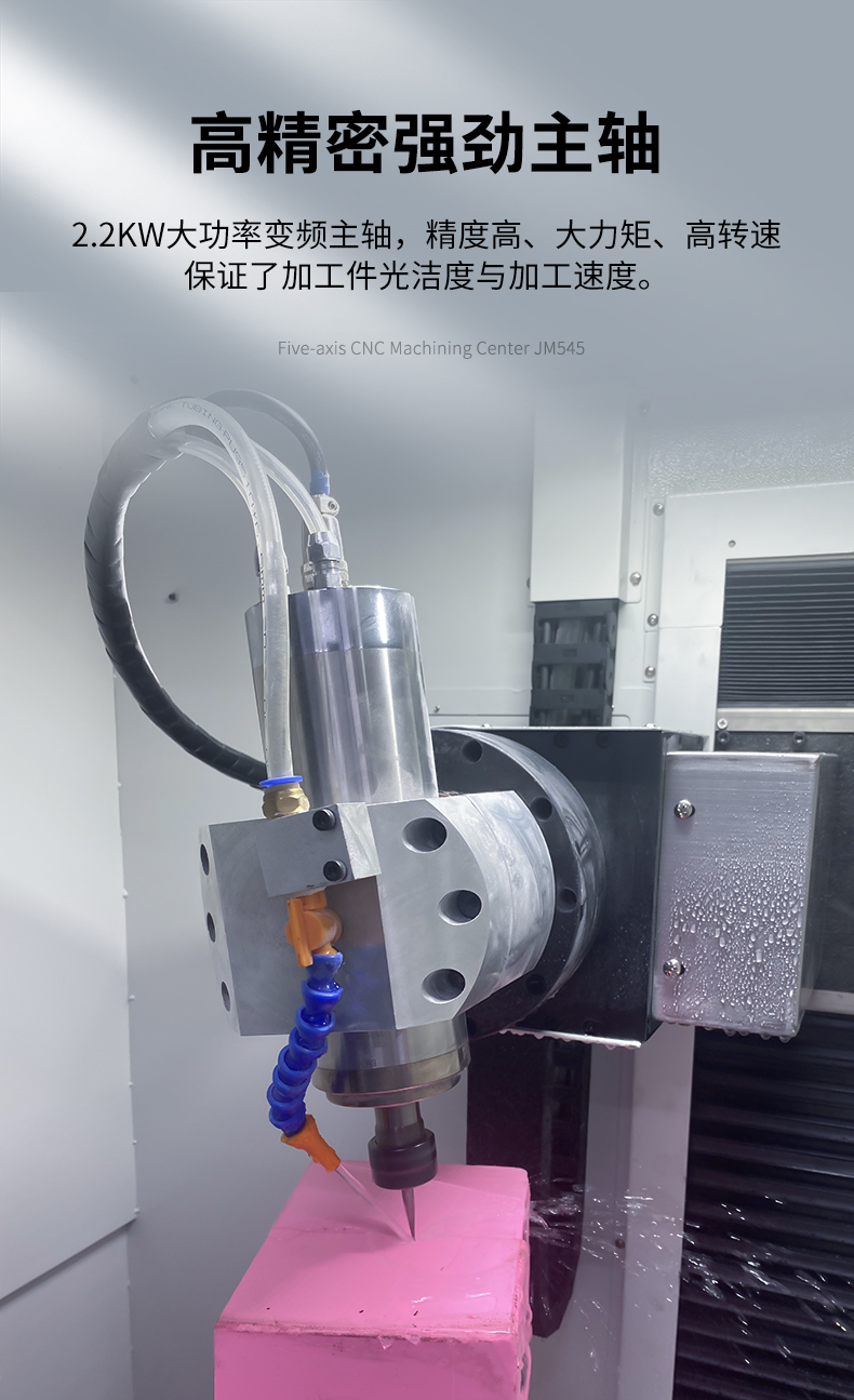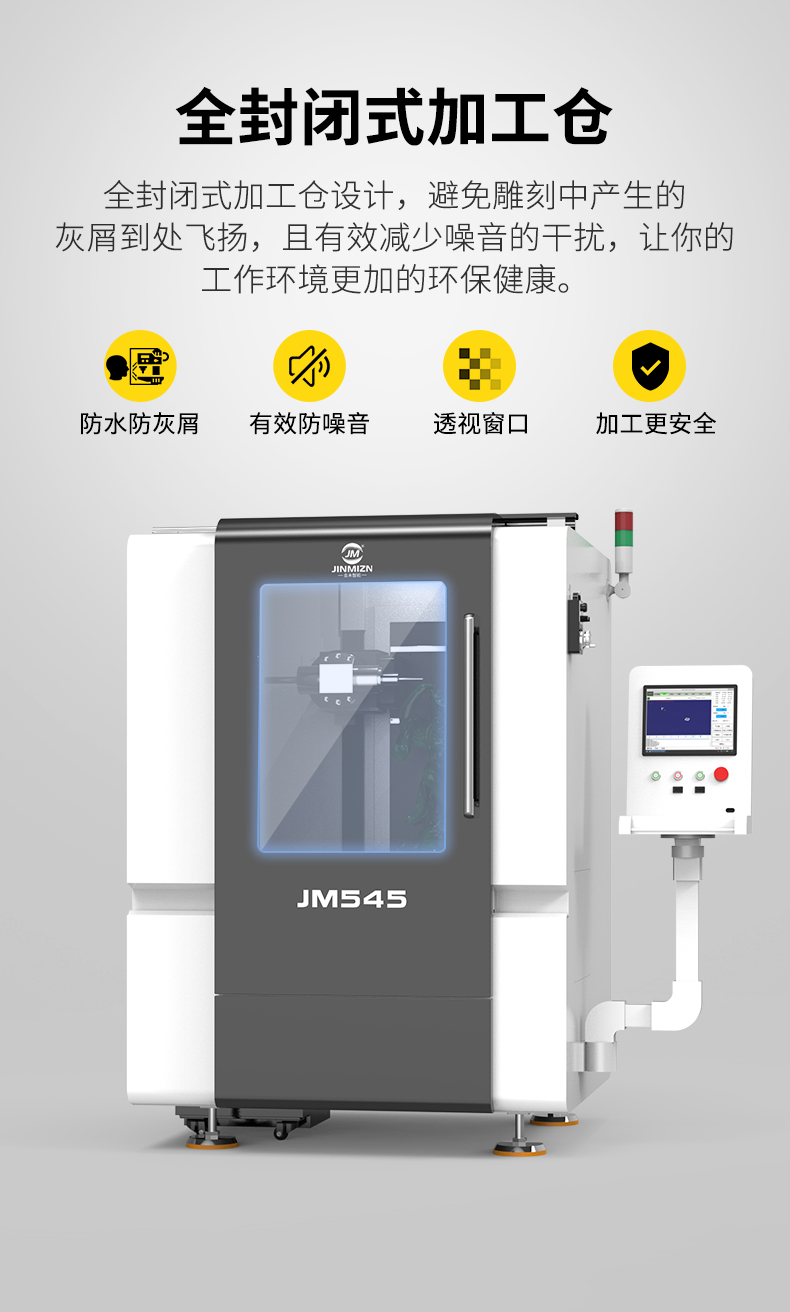 JM5035是一款全封閉式設計的中型五軸聯動雕刻機采用先進的擺頭式+轉臺式(B軸+C軸)設計結構,主軸靈活擺動善于一次性將復雜的立體曲面雕刻、斜角鏤空雕刻、砵體掏空、不規則體雕刻等。 RTCP刀尖跟隨功能:專業五軸觸屏數控操作系統帶RTCP刀尖跟隨功能操作簡單易學。 XYZ三軸均采用高精密直線導軌導向驅動部分采用伺服電機帶動高精度滾珠研磨絲桿。五軸部分采用高精密諧波減速機實現高精度角度定位和傳遞扭矩。 主結構采用整體鑄鐵結構,保障機床長期不變形,加工時保證機床的高剛性、高抗振性能和高精度的平穩運行。