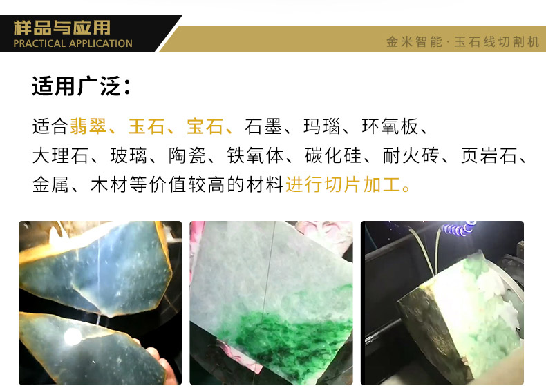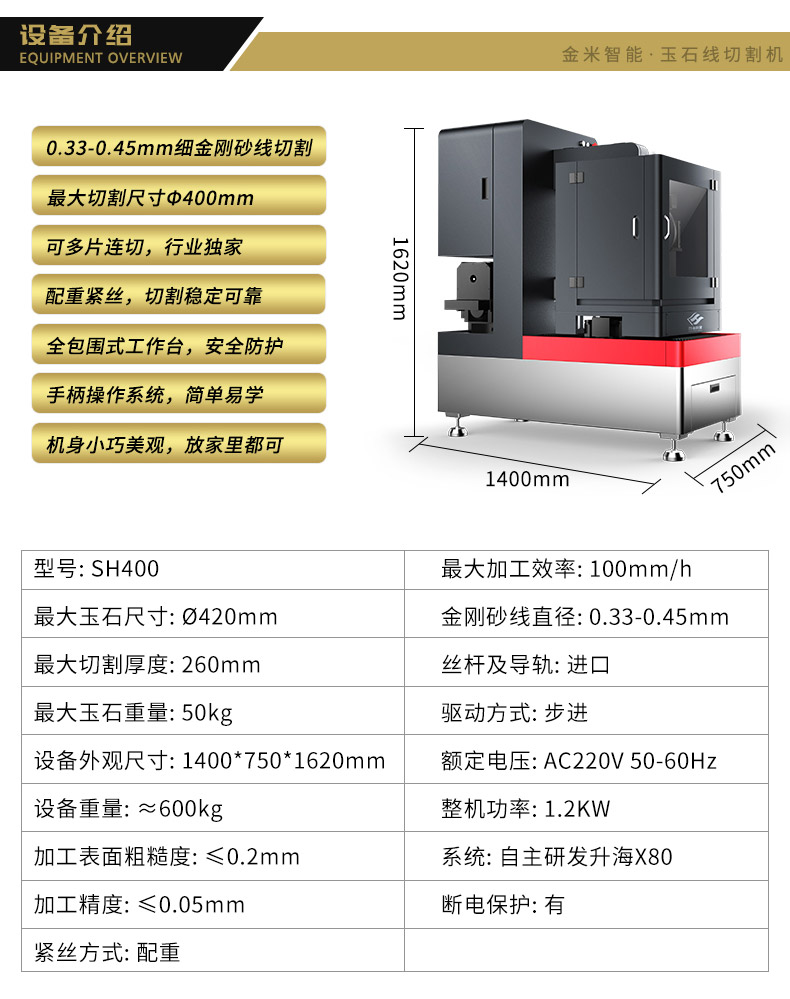 SH400是一款專門針對玉石、寶石切割而研發(fā)的玉石線切割機(jī)設(shè)備。 使用0.33-0.45mm的金剛砂線切割,省料保料,切口平整光滑相對于用水切/油切 省料5倍。可多片連切,行業(yè)獨(dú)家,手柄操作,簡單易懂。適用范圍廣泛:翡翠、玉石、石墨、瑪瑙、環(huán)氧板、大理石、 玻璃、陶瓷、鐵氧體、碳化硅、耐火磚、頁巖石、金屬,木材 等價(jià)值較高的材料進(jìn)行切片加工