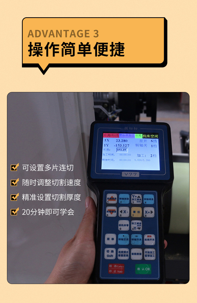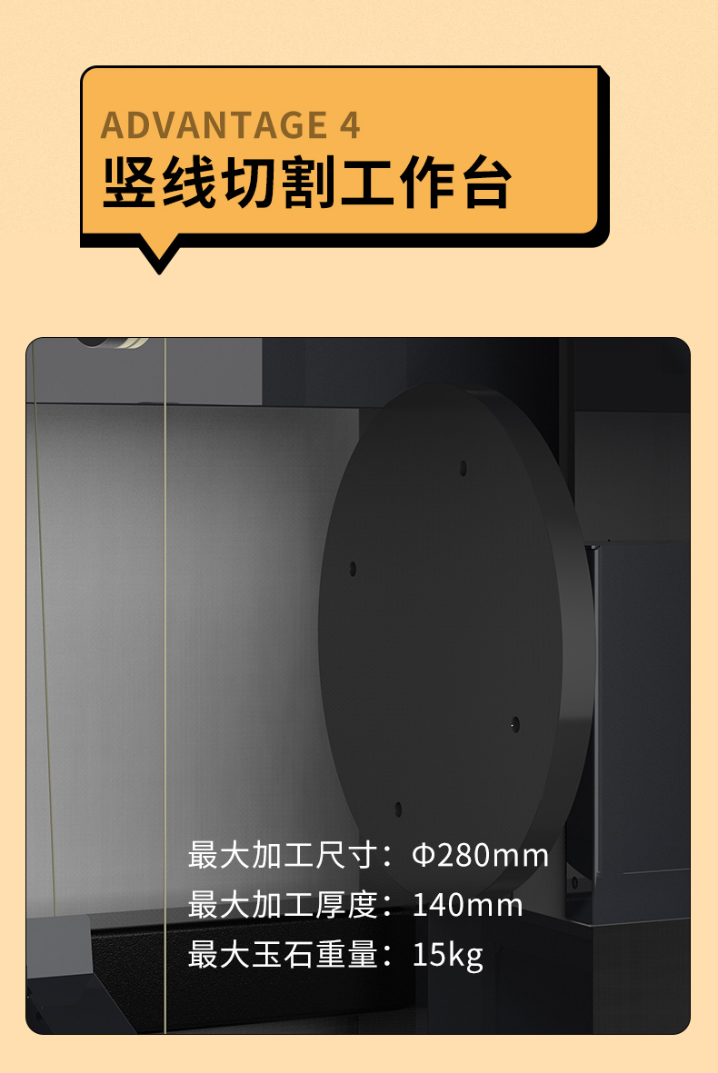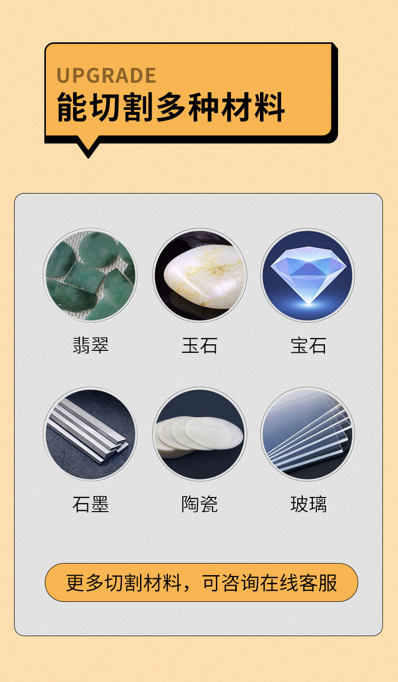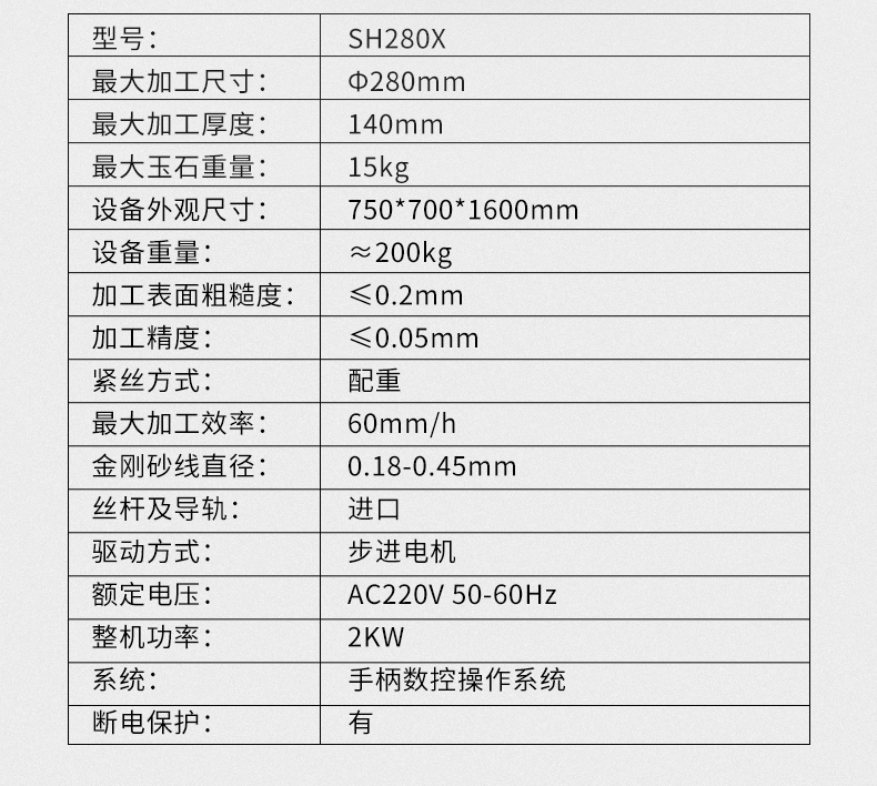 1、SH280X是一臺(tái)金剛砂線切割機(jī),適合切割多種材料:玉石、翡翠、和田玉、寶石、石墨、陶瓷、玻璃等多種材料。2、可以使用超細(xì)砂線切割,比市面上的玉石切割機(jī)更省料。3、選用進(jìn)口絲桿與導(dǎo)軌,優(yōu)勢電機(jī),使得精度更高,穩(wěn)定性強(qiáng),切面平整光滑,切口不崩料,可切割薄如紙張的厚度都沒有問題。4、傻瓜式操作系統(tǒng),半個(gè)小時(shí)左右即可以學(xué)會(huì),可設(shè)置多片連切,隨時(shí)調(diào)整切割速度,精準(zhǔn)設(shè)備切割厚度。5、豎線切割工作臺(tái),更方便切割直徑280mm以內(nèi)的料子。6、靜音 安全 環(huán)保,采用砂線切割,靜音不砂雜,可直接放家里不影響生活。全自動(dòng)切割,不易傷手。
