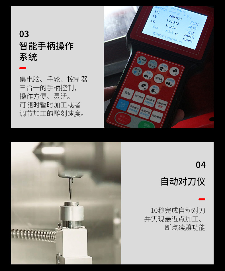 1、針對金、銀、合金、金屬飾品雕刻而研發(fā)的首飾浮雕雕刻機(jī),可浮雕、平面鏤空、刻字、花紋、山水、人物等各種雕刻。 2、工作臺采用磁鐵吸盤,更方便用于加工金屬類的材質(zhì)。 3、選用金米自主研發(fā)的手柄操作系統(tǒng),傻瓜式操作,簡單易學(xué);具備自動對刀儀,解除繁瑣的手動對刀環(huán)節(jié),開粗、精加工切換、斷刀換刀再無煩惱;斷點(diǎn)記憶,雕刻中途可停,隨時復(fù)加工。 4、重型機(jī)身全鋼精加工,進(jìn)口滾珠絲杠、直線方軌傳動。 5、整機(jī)帶防塵外罩,降噪防塵,適合室內(nèi)使用,噪音水平遠(yuǎn)低于普通雕刻機(jī)。