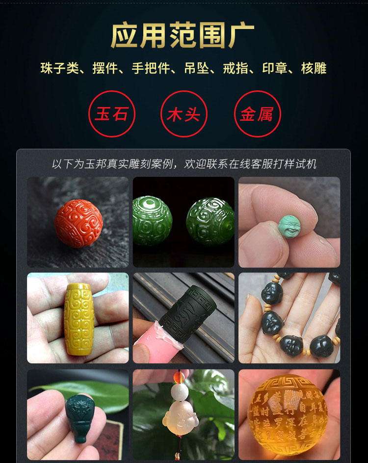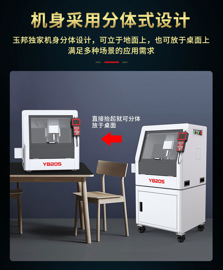 YB20是一款小型立體雕刻機,專門針對小型的立體雕刻而設計,擁有高精細的雕刻能力。適合雕刻:回紋珠子、扳指、小擺件、小手把件,吊墜掛件,橄欖核等。適合材料:翡翠、和田玉、岫玉、瑪瑙、黃龍玉、鵝卵石等所有軟硬玉以及玻璃、銀、金屬、琥珀等。整體機身迷你實用,不占空間,且機身采用分體式設計,可以獨立放置地面,也可以分體放于桌面。